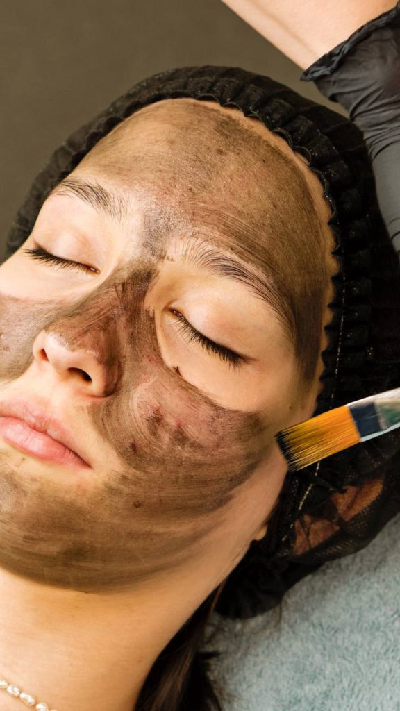 Нанесение карбоновой маски. Маска с активированным углем равномерно распределяется по лицу. Это средство глубоко проникает в поры, подготавливая их к воздействию лазера;