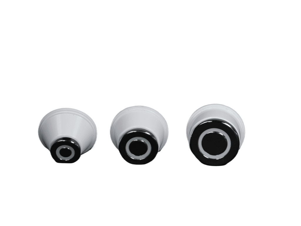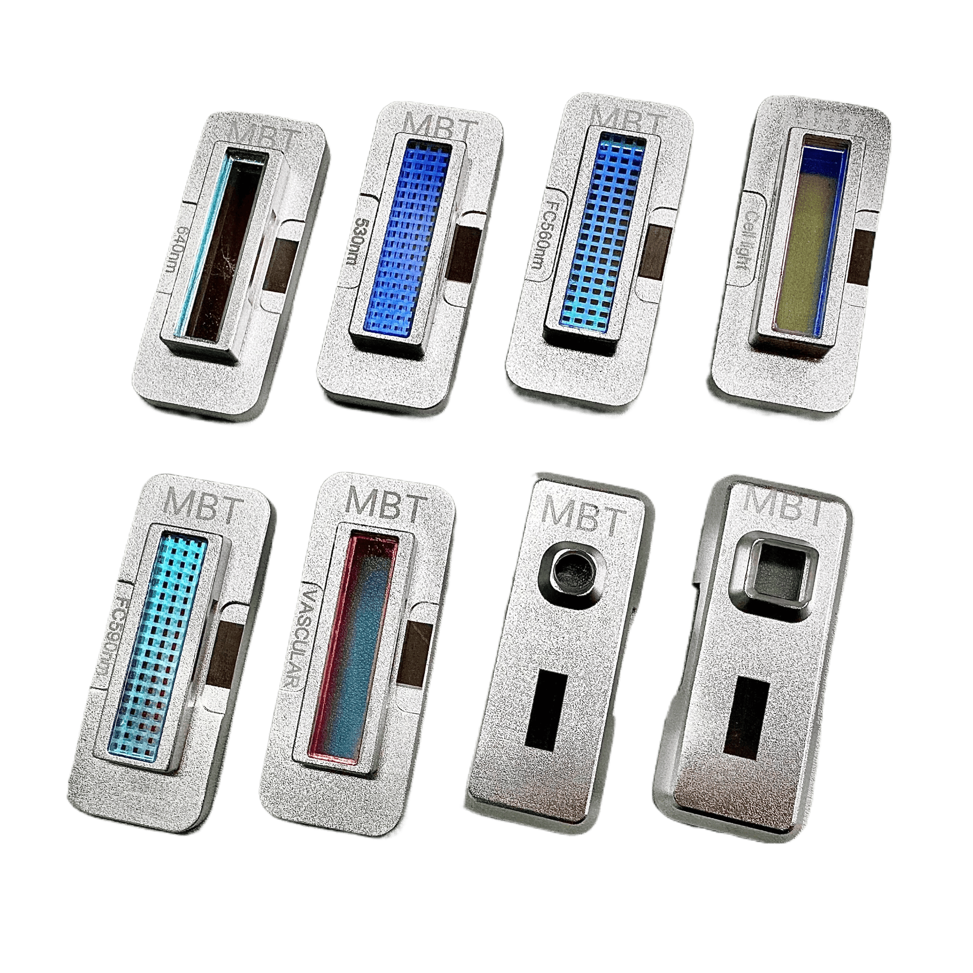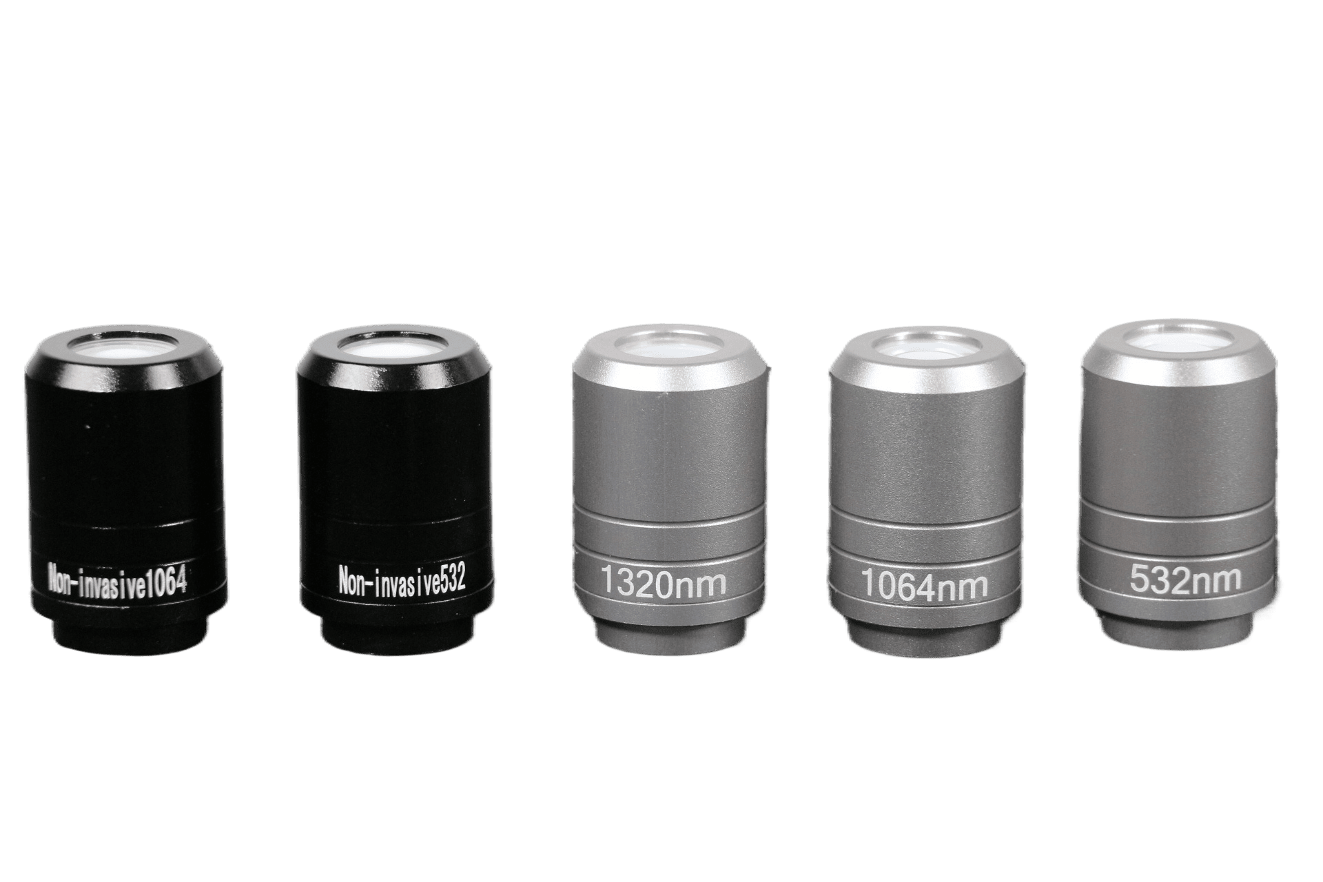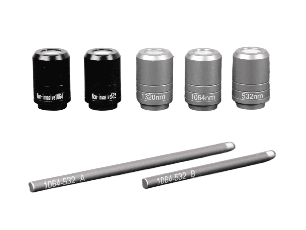 Для работы с различными пигментами предусмотрено 5 сменных насадок: на основные длины волн 1064 нм (для темных пигментов), 532 нм (для ярких и красных пигментов), специальная насадка для карбонового пилинга ~1320 нм) и 2 фракционные (неинвазивные) насадки, рассеивающие луч, – они используются для лазерного омоложения кожи без повреждения эпидермиса (так называемый «пикотонинг» или дробный лазерный терапевтический эффект).